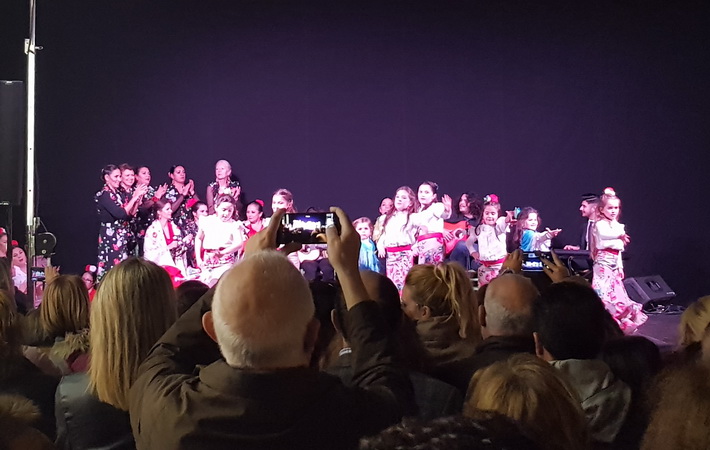 En la plaza, repleta de punta a punta, se han vivido momentos muy entrañables con las actuaciones de los diferentes grupos de baile de la escuela de María la Canastera, acompañada al cante por la propia María y a la guitarra Niño Carmelo.