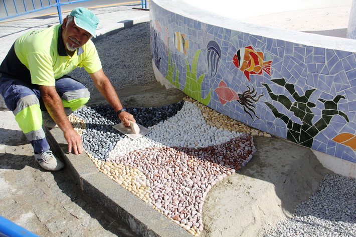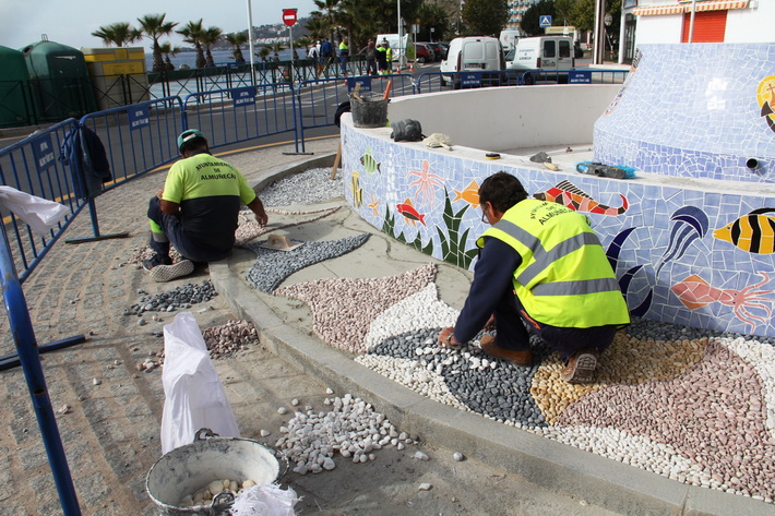 La construcción de la nueva fuente ornamental que acoge la rotonda de acceso al paseo de San Cristóbal y Cotobro llega a su recta final. Lo hace con la construcción de un empedrado granadino artístico alrededor con piedras de cuatro colores y con diseño similar al que tenían las baldosas del Paseo del Altillo.