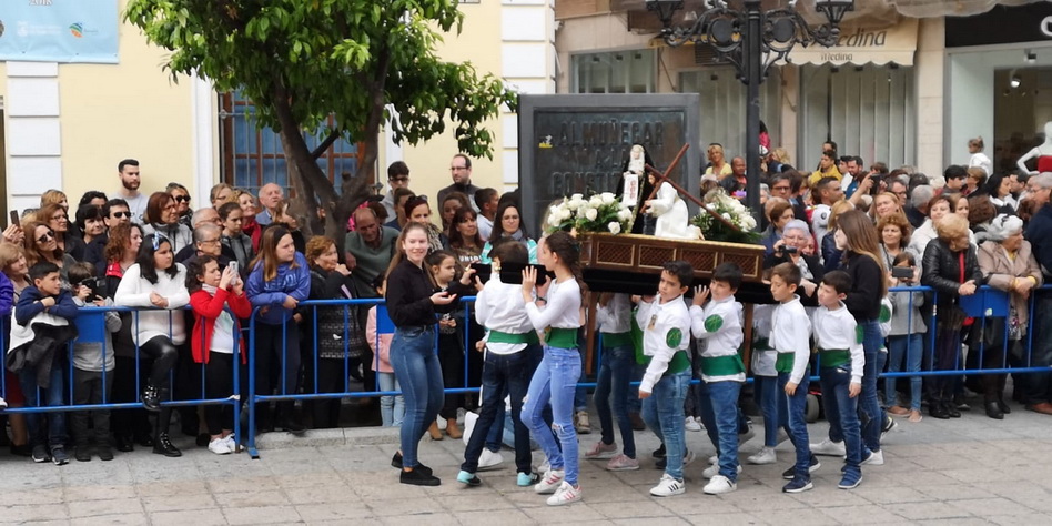 Son “Los Macarenos”, la procesión más grande de los niños. La salida más esperada del fin de la semana de pasión. La que recorre todos los rincones del centro de Almuñécar portando sus tronos minúsculos mientras bailan sus imágenes al son de sus propios instrumentos, arropados por la banda municipal de música, ante la atónita mirada de los turistas y la admiración de sus padres, madres y familiares.