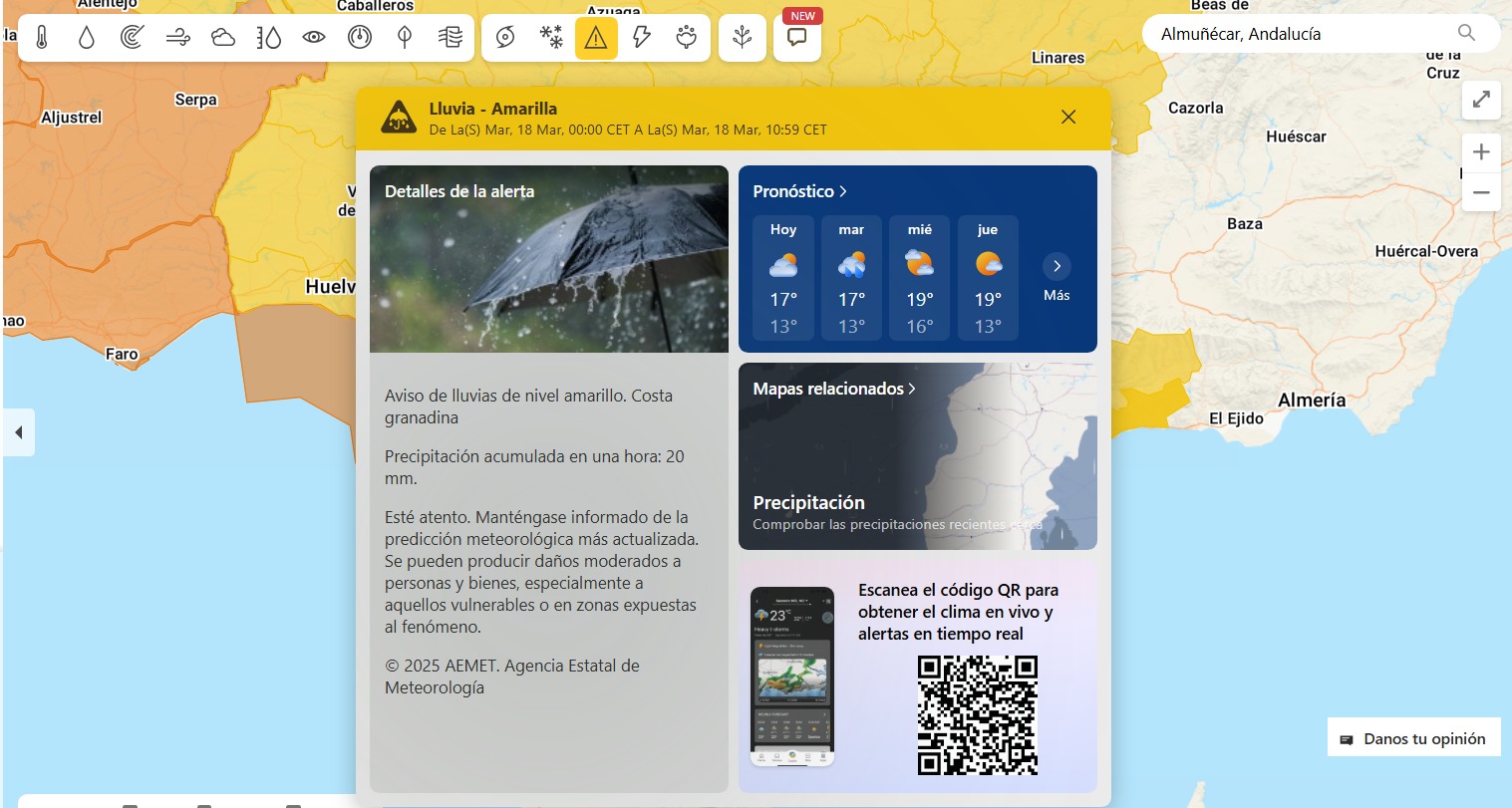 La Agencia Estatal de Meteorología (Aemet) mantiene activado el aviso amarillo por lluvias y tormentas en las provincias de Huelva, Sevilla y Cádiz, así como en las comarcas cordobesas de Sierra y Pedroches y Campiña, en Morena y Condado (Jaén) y en las malagueñas Ronda y Sol y Guadalhorce. En estas dos últimas comarcas se elevará el aviso a nivel naranja a partir de las 18:00 horas.