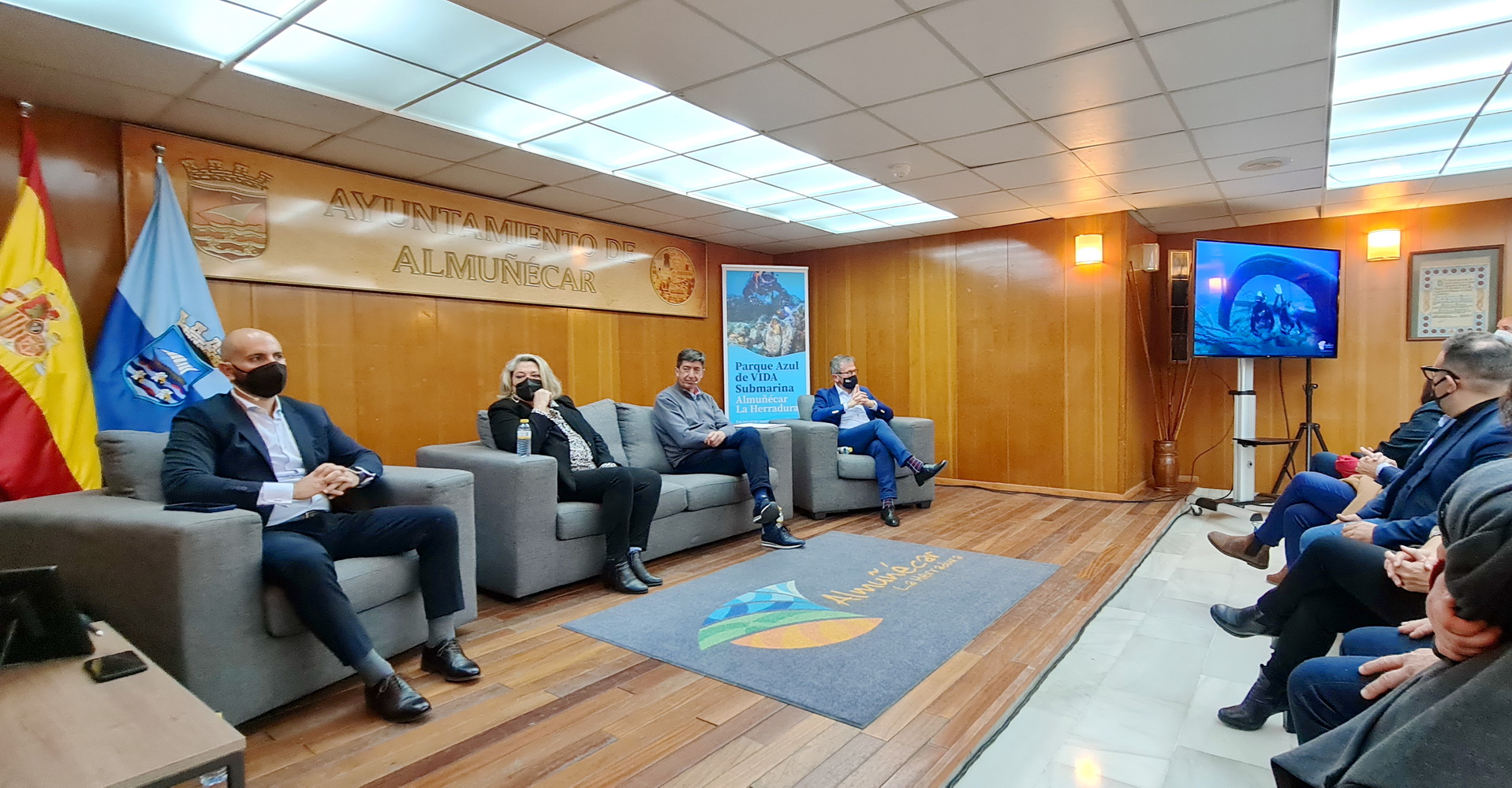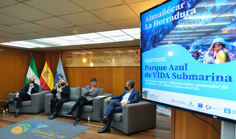 El vicepresidente de la Junta y consejero de Turismo, Regeneración, Justicia y Administración Local, Juan Marín, ha presentado en Almuñécar el proyecto Parque Azul Vida Submarina que va a desarrollar la localidad, acompañado por el delegado territorial de Turismo, Gustavo Rodríguez, la alcaldesa, Trinidad Herrera y el concejal de Turismo, Daniel Barbero.