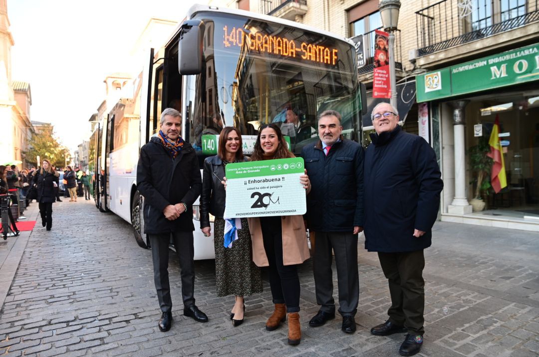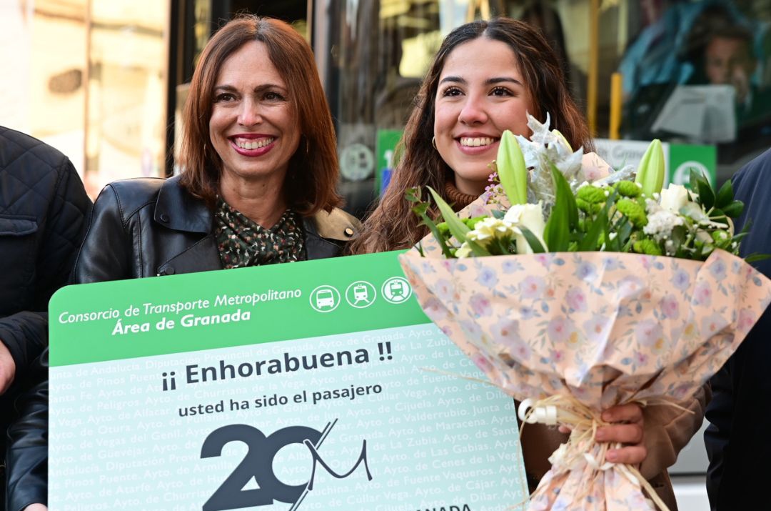 El Consorcio de Transporte Metropolitano del Área de Granada ha rebasado la barrera de los veinte millones de viajeros en 2023 y cerrará el año batiendo un récord histórico de usuarios. La consejera de Fomento, Articulación del Territorio y Vivienda, Rocío Díaz, ha asistido a un acto con motivo del viajero veinte millones, cifra que alcanza por primera vez el Consorcio en sus dos décadas de historia. La viajera número veinte millones ha sido Lucía Moreno, una estudiante de la Universidad de Granada, natural de Tenerife, que ha confesado ser usuaria habitual del transporte público y que viajaba en ese momento en la línea 140 de Granada a Santa Fe para visitar la Feria de Arte del municipio y la exposición permanente del primer viaje a las Indias de Cristóbal Colón y las rutas guiadas a los cuatro Arcos. La viajera ha recibido de manos de la consejera un obsequio por ser la viajera veinte millones y le ha agradecido su compromiso con el transporte público del área metropolitana de Granada.