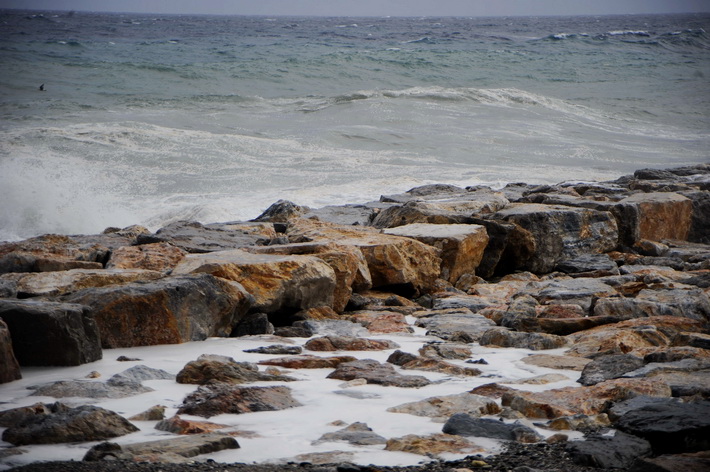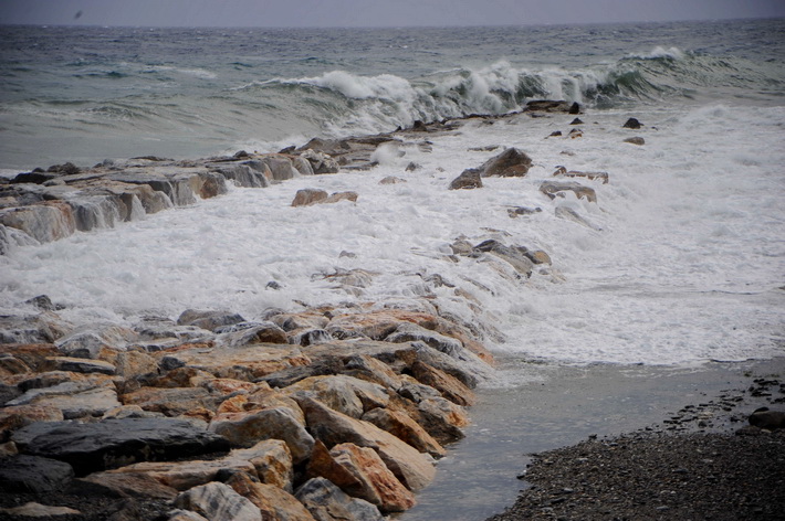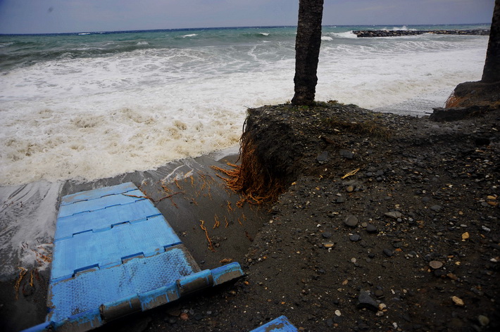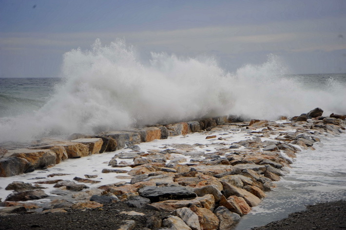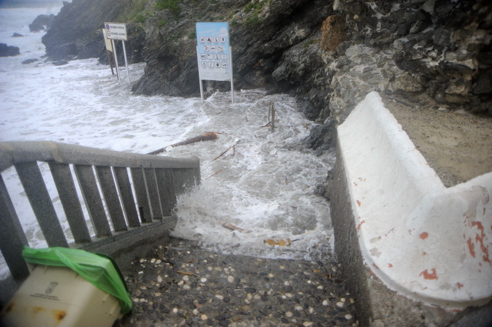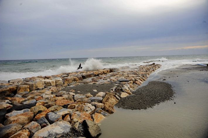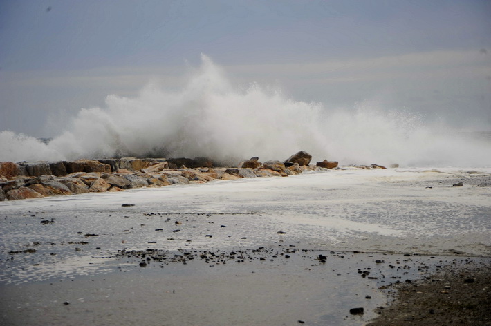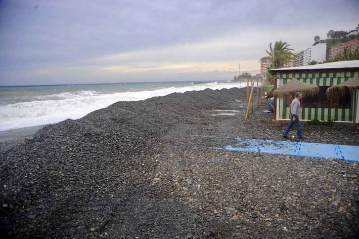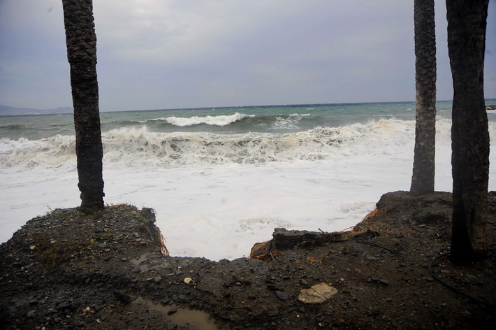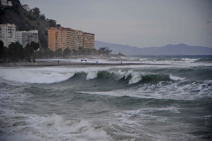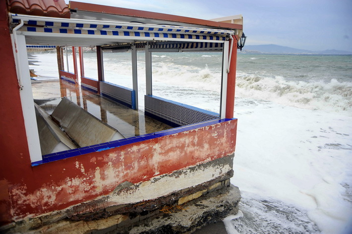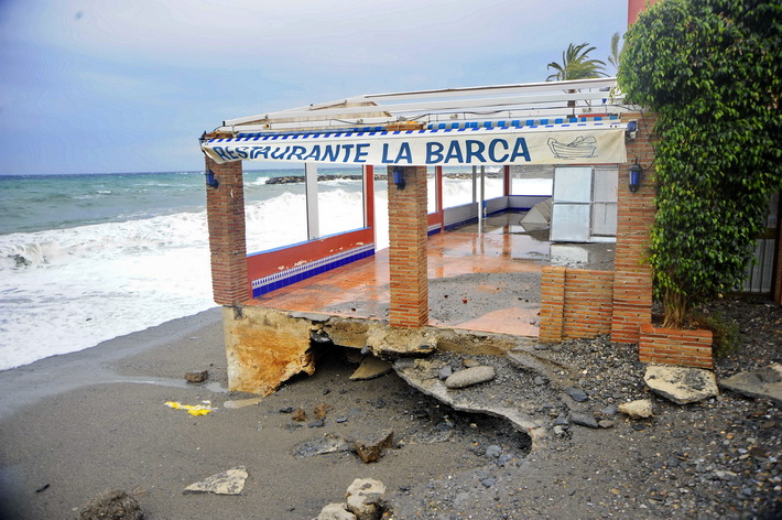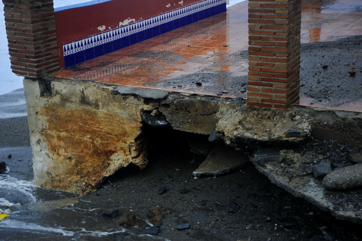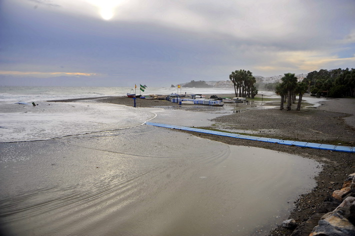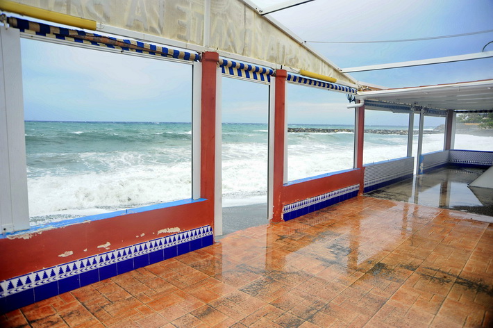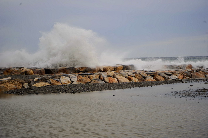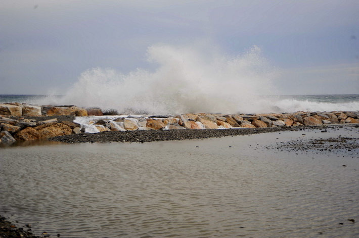 Los efectos también se vieron en la playa Fuente Piedra donde el espigón de piedras cumplía su cometido de protección, a pesar de sobrepasar las olas el mismo.