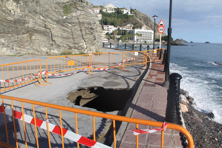 El primero se trata de la rotura de buena parte de la escollera de defensa de la senda que separa el parque acuático, en la zona este, ya que el fuerte oleaje llegó a derrumbar el muro del vallado, afectando a la terraza del restaurante. A ello se suma un gran socavón de varios metros cúbicos, producido en el mismo vial de la playa de Cotobro, que comunica con la zona oeste de la urbanización y La Herradura. Esto determinó por parte de la Policía Local y Mantenimiento Municipal procedieron al vallado y corte de las comunicaciones.