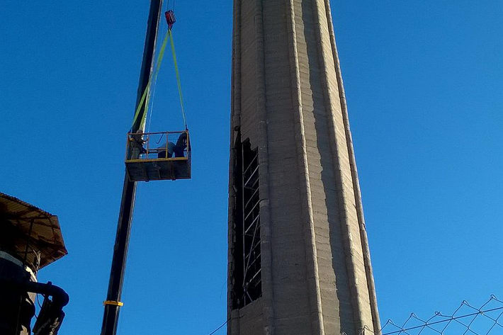 Las actuaciones que se llevan a cabo, y que cuentan desde este mismo lunes con varias grúas de gran tamaño, consisten en la reparación de los daños ocasionados por el viento, así como en asegurar definitivamente la estructura de la chimenea.
