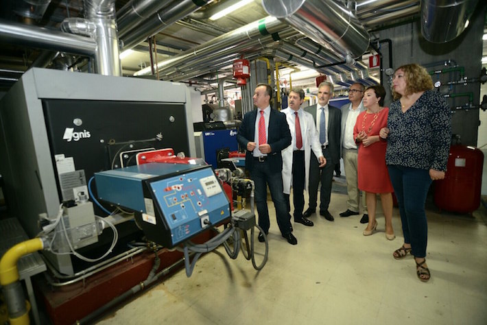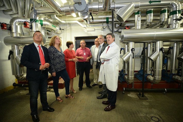 Además, el consejero ha conocido de primera mano el nuevo sistema de gestión energética con el que cuenta el hospital. Las nuevas instalaciones de producción de energía térmica están compuestas por cuatro sistemas básicos: un nuevo sistema de producción de agua fría para climatización; otro para la generación de calor; uno más para la producción de agua saliente sanitaria mediante energía solar combinada con energía de calderas y otro para la producción de vapor. Este nuevo sistema, como ha expuesto Aquilino Alonso, tiene como objetivos básicos mejorar la seguridad de funcionamiento de las instalaciones críticas de producción de energía térmica disminuir los consumos y emisiones de CO2 equivalentes, aumentando la eficiencia energética de los sistemas de producción térmica.