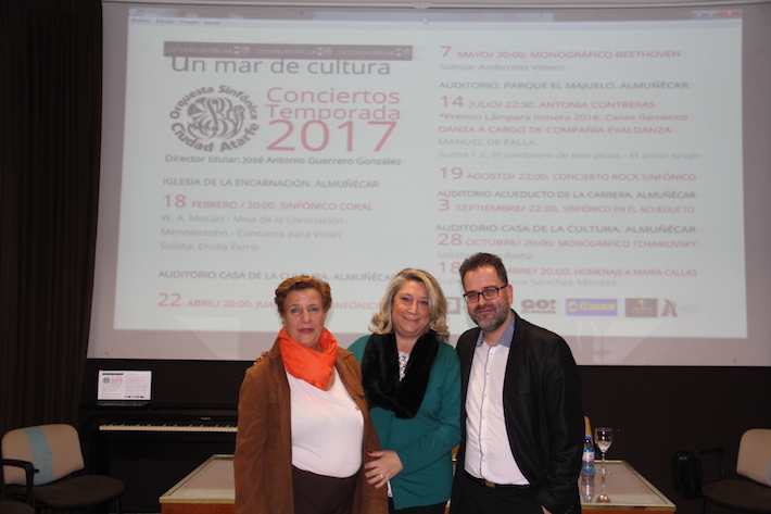 Gracias fue la palabra que más se pudo escuchar en el acto de presentación del programa de conciertos que la Orquesta Sinfónica Ciudad de Atarfe llevará a cabo este año en la localidad sexitana. Y es que tanto el director de la misma, José Antonio Guerrero, como los artistas invitados presentes se mostraban muy agradecidos “por confiar en este programa , tanto a la Alcaldesa de Almuñécar como a la Concejal de Cultura. Esto nos va a permitir seguir desarrollando nuestra actividad en nuestra tierra”, vinieron a destacar todos desde el propio director de la OSCA hasta la ganadora del Premio Lámpara Minera 2016, Antonia Contreras, pasando por la violinista, Emilia Ferriz; el solista, Ambrosio Valero; así como representante de la compañía Evaldanza, a las que se suman el cantaor, Juan Pinilla; la soprano sexitana, Cristina Sánchez Montes, o el solista, Jesús Reina, entre otros.
