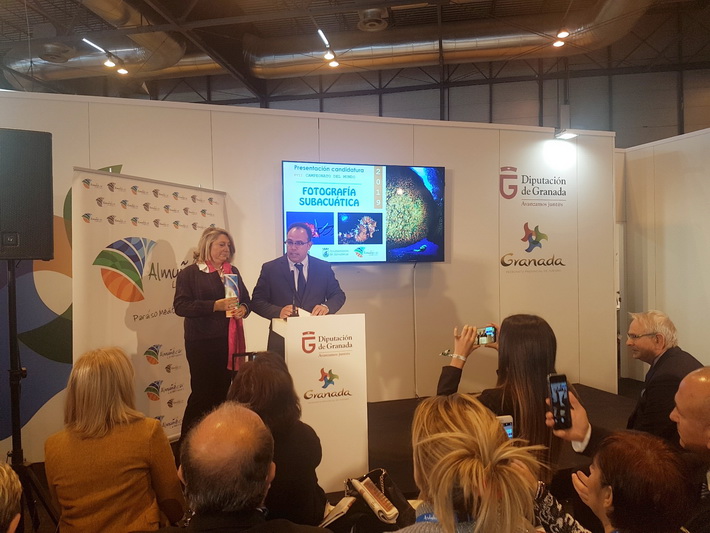 La alcaldesa de Almuñécar, Trinidad Herrera, acompañada del teniente de alcalde y delegado de Servicios de La Herradura, Juan José Ruiz Joya, y el concejal de Turismo, Rafael Caballero, han dado a conocer y presentar ante la sociedad turística presente en la Feria Internacional de Turismo de Madrid (Fitur) la candidatura que La Herradura ante la Confederación Mundial de Actividades Subacuáticas para albergar el 17º Campeonato Mundial de Fotografía Subacuática que se celebrará en el año 2019.