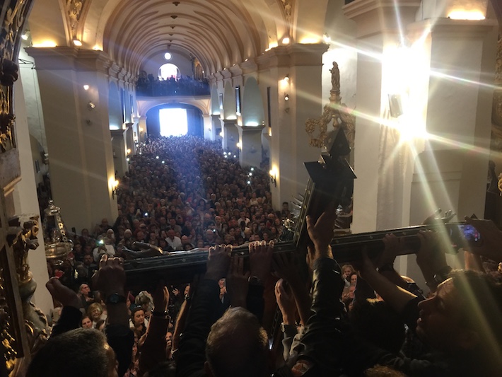 A las 12 en punto del mediodía orgiveños, visitantes y devotos no han querido faltar a la cita un año más para presenciar el inicio de los actos de celebración del copatrono de Órgiva. Y lo han hecho con el descendimiento de la imagen del Cristo de la Expiración desde el interior de la abarrotada Iglesia de Nuestra Señora de la Expectación de Órgiva. La bajada del Cristo desde su camarín hasta el altar mayor se convierte en uno de los momentos más emotivos y emocionantes, en el que la imagen es aclamada por los asistentes entre lágrimas de emoción, vítores, palmas, el estruendo de la pólvora y el acompañamiento de la Asociación Musical Exoche de Órgiva.