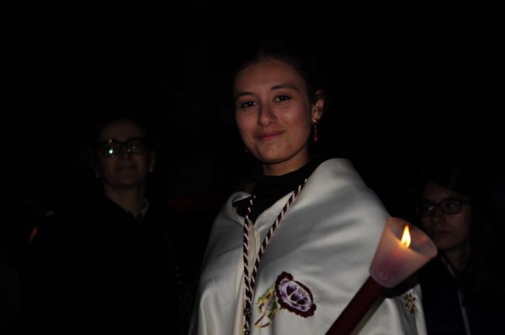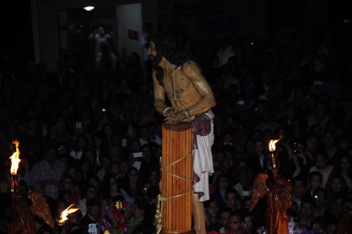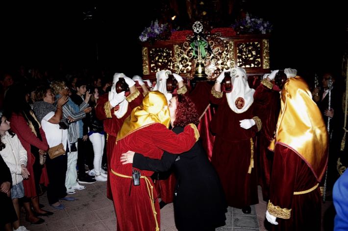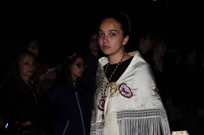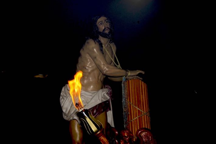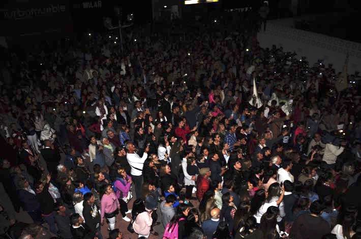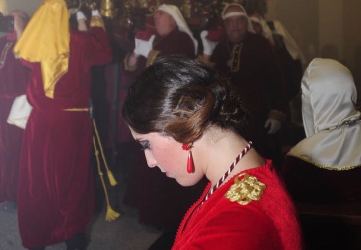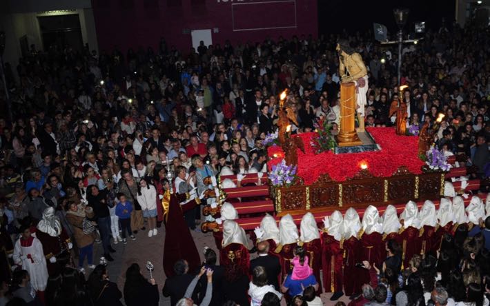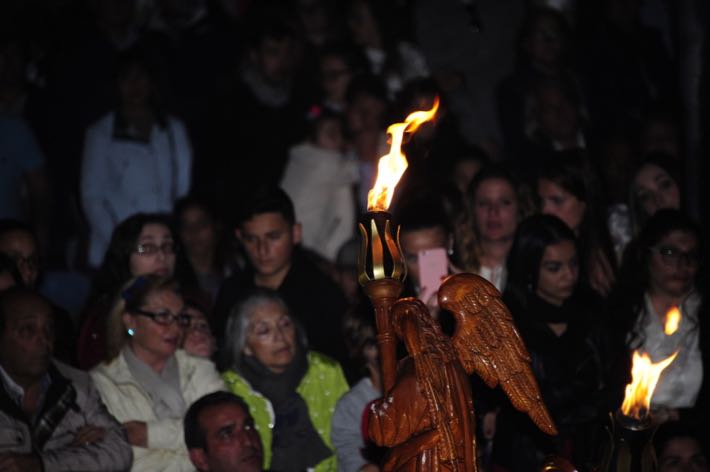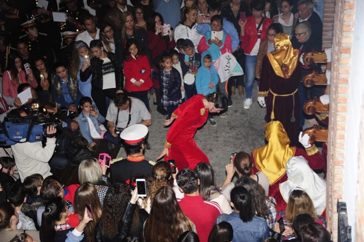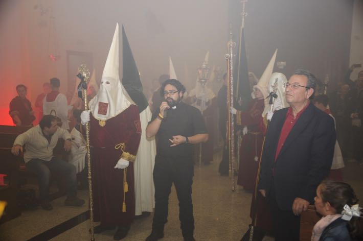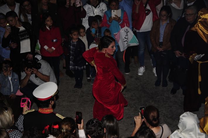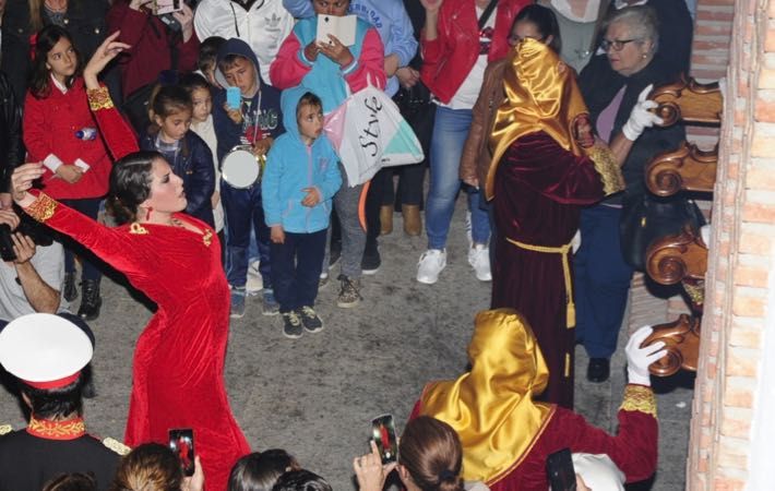 Como ya viene sucediendo desde hace un par de años, la bailaora Paola Almodovar lo recibe a las puertas del templo bailando a la luz de las antorchas, mientras suenan las saetas y el flamenco más religioso.