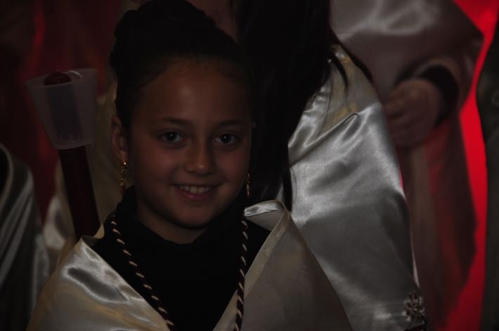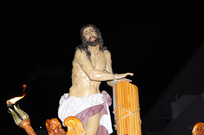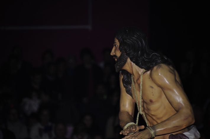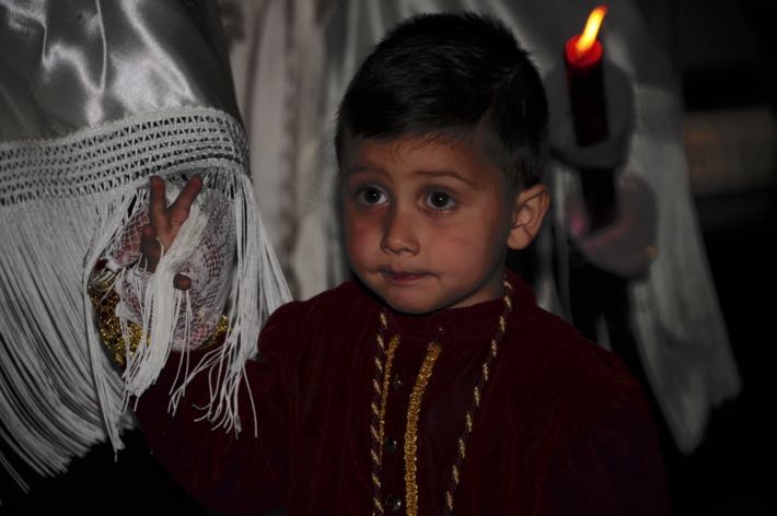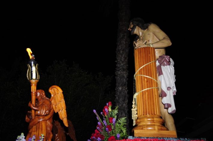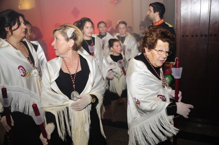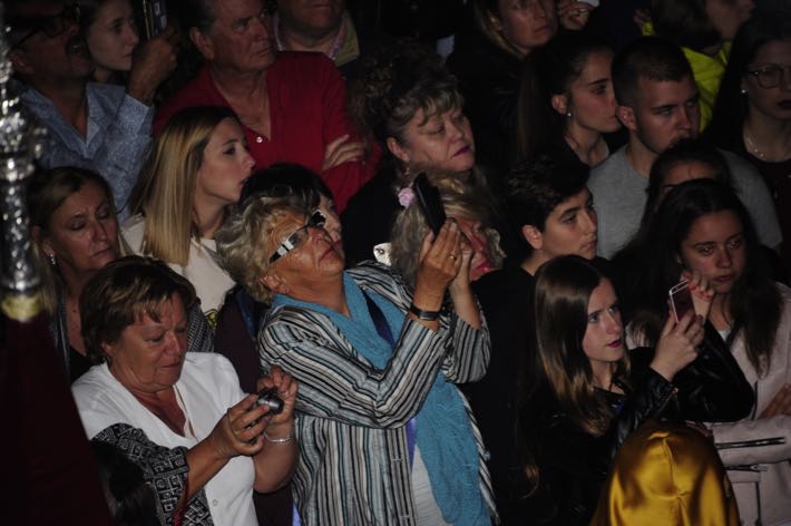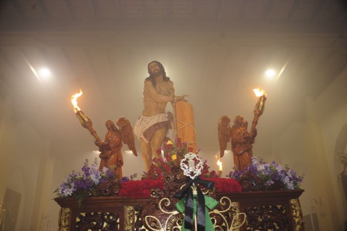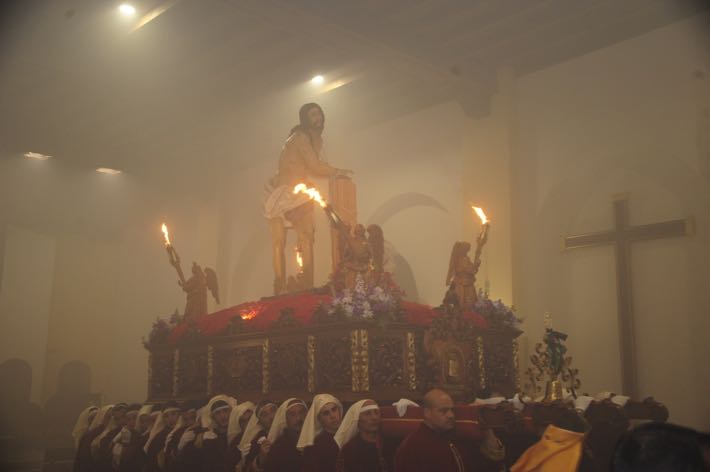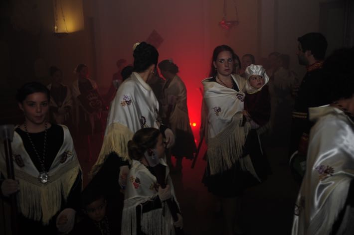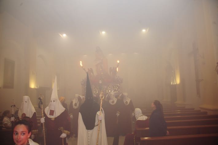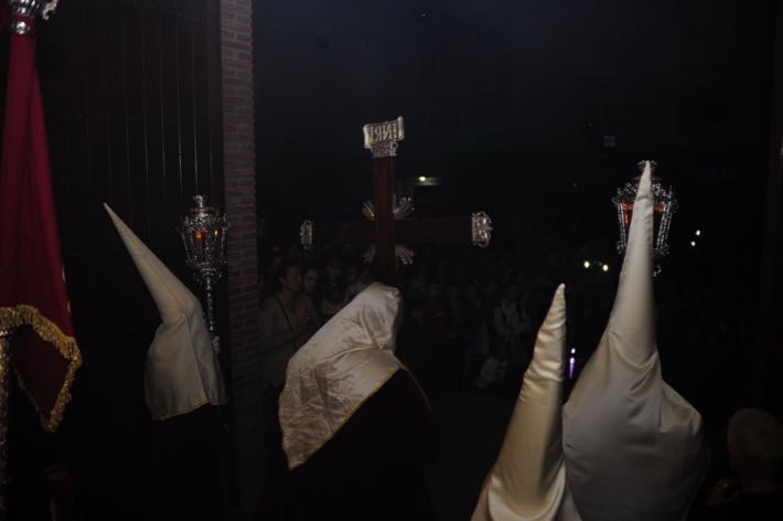 Como ya viene sucediendo desde hace un par de años, la bailaora Paola Almodovar lo recibe a las puertas del templo bailando a la luz de las antorchas, mientras suenan las saetas y el flamenco más religioso.