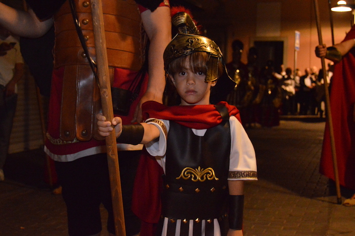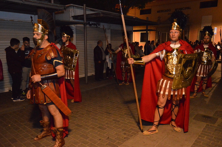 La novedad del cortejo procesional, que pasó por la Iglesia de la Victoria para rendir honores a la Salud y el Mayor Consuelo en su 50 aniversario, llegó de la mano de la legión de ‘romanos’ que acompañó al Santo Sepulcro ataviados con las ropas tÃpicas y bajo el mando de un ‘centurión’.