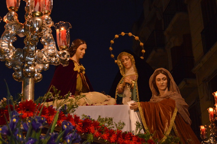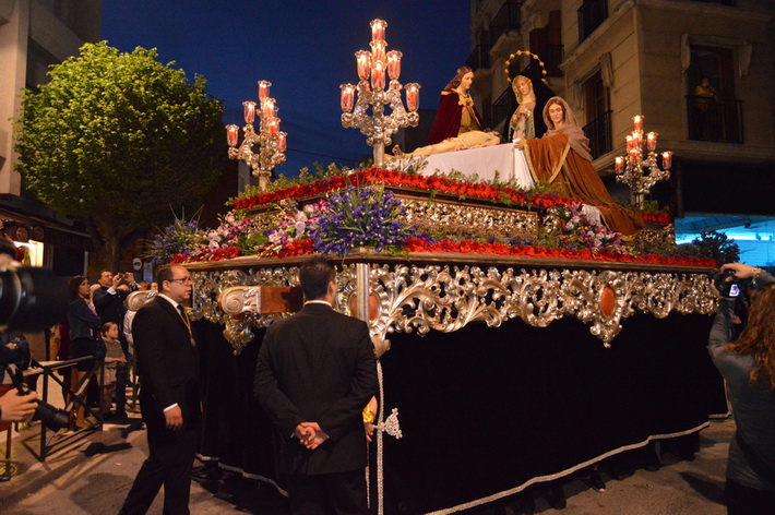 Pasadas las 20,00 horas la Casa Hermandad de la calle Santa Ana abrió las puertas para dejar salir al paso de misterio del Cristo Yacente, el más grande de la Semana Santa de la ciudad con las tres figuras que lo acompañaron tras su muerte.