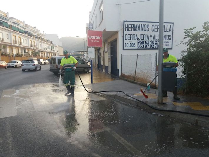Si ayer se ponía a punto el Barrio Los Marinos, que desde este fin de semana celebra sus fiestas patronales, este jueves el turno llegó al Barrio San Sebastián y las aceras de la zona de Laderas de Castellar.