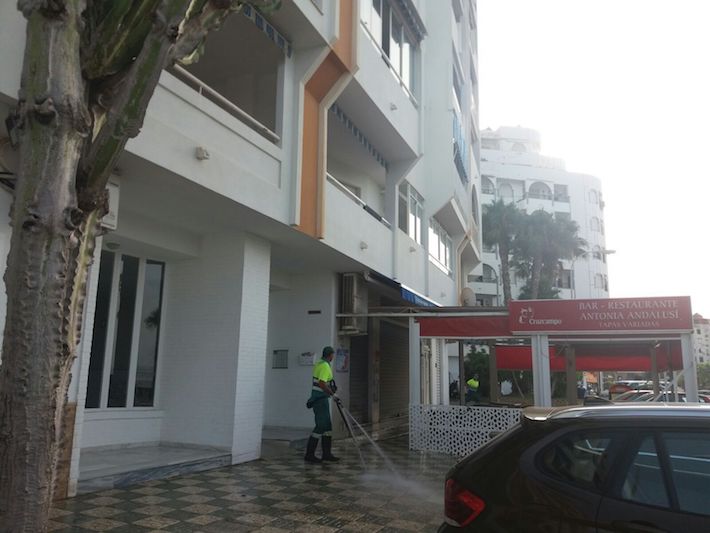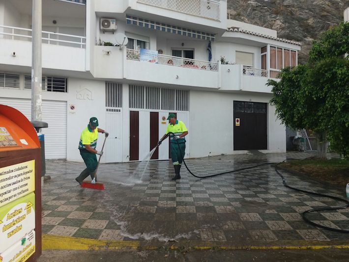El servicio de baldeo cuenta con cuatro equipos, tres de FCC y un equipo de Limpiezas Andrea que cada día se emplea a fondo para estas tareas.