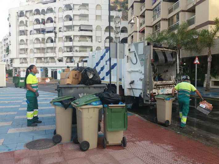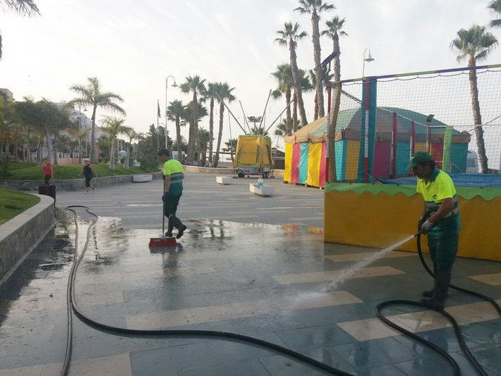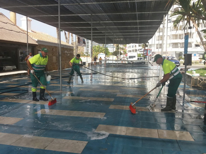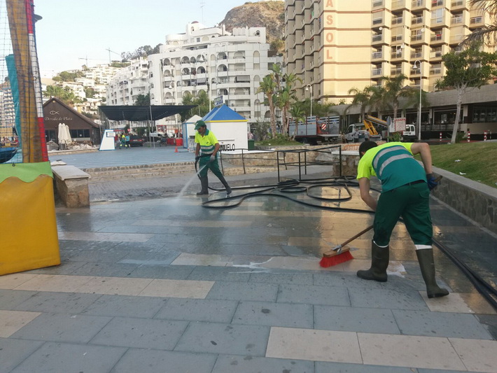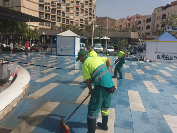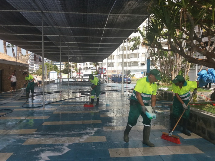 Después de tres días intensos de fiestas tocaba hoy recuperar la zona ocupada por la caseta y barra en el paseo situado junto a La Dorada de Plata. Para ello una decena de operarios de la empresa adjudicataria, FCCC, se han empleado a fondo con limpieza y baldeo de la zona desde primera hora de la mañana, una vez desalojado el mobiliario de las fiestas.