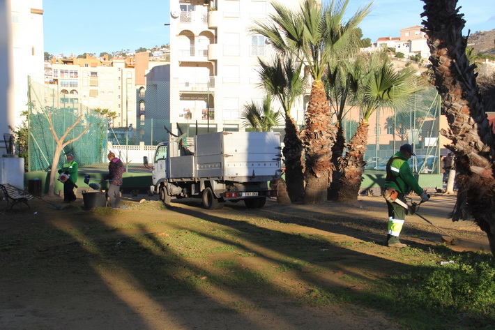 Este lunes concluía la poda y árboles y adelfas del parque La Sandovala situado junto a la avenida Amelia Sánchez de Alcázar, junto al pabellón de deportes y arrancaron los trabajos en el parque de los Jardines de Mariote, donde se ubica la plaza de Nelsón Mandela.