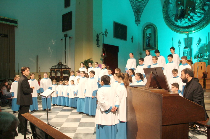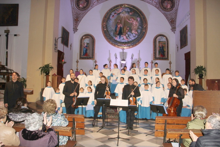 La actuación de la EscolanÃa y Orquesta de Cámara de Lluc (Mallorca), se centró en la interpretación de la obra, Stabat Mater, de G.B. Pergolesi, que ocupó la primera parte. Tras el descanso cantaron temas de Rovanello, Menegali, F. Mendelssohn, Pau Casals o al Salve Regina, de Miklós Kocsár. Todo ello bajo la dirección de Ricard Terradas.