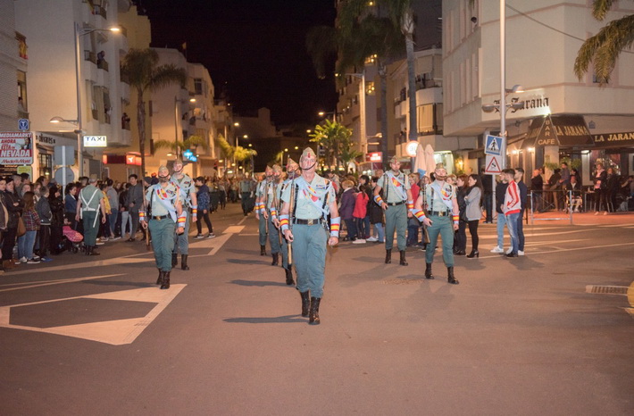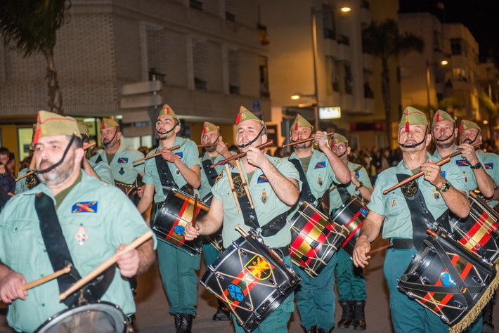 La buena temperatura y el gran cortejo procesional que abría una representación de tambores y cornetas de caballeros legionarios hicieron que las calles y avenidas se llenaran de público durante todo el recorrido. Nunca se recordaba un Lunes Santo con tantas personas en la calle. Desde una hora antes de la salida del paso, que realizara el imaginero granadino, Miguel Zúñiga Navarro, del templo parroquial de la Encarnación, ya aguardaba expectante el público.