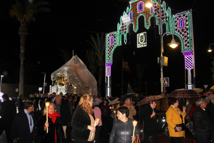 La solemne procesión del patrón San José por la calles de La Herradura se llevó a cabo este año aunque durante el recorrido hizo acto de presencia un tímida lluvia intermitente que obligó a cubrir la imagen a su paso por la Acera del Pilar y la llegada hasta el paseo Andrés Segovia.