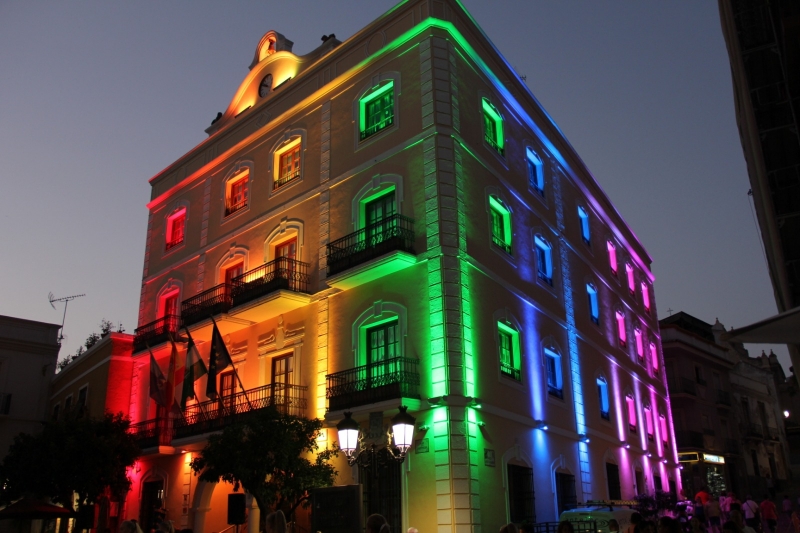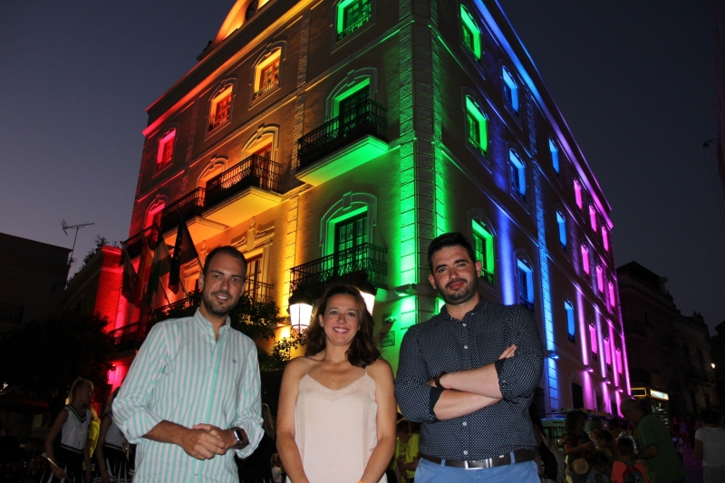 Los ediles, Beatriz González, Alberto García Gilabert y Javier García, han asistido hoy al encendido multicolor del Ayuntamiento de Almuñécar.El alumbrado conmemora la celebración del Día Mundial del Orgullo LGTBI.