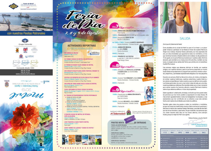 La alcaldesa de Motril, Luisa GarcÃa Chamorro, ha presentado esta mañana el programa de las fiestas patronales de Motril que tendrán lugar entre el 7 y el 16 de agosto, acompañada por la teniente de alcalde de Seguridad Ciudadana, MarÃa Ãngeles Escámez, la concejal de Fiestas, Magdalena Banqueri, y la hermana mayor de la CofradÃa de Nuestra Señora la Virgen de la Cabeza, MarÃa José Garrido. GarcÃa Chamorro ha destacado que se trata de un programa “muy completo y diversoâ€, en el que se han incluido actos culturales, conciertos, pruebas deportivas y fiestas tradicionales y actividades para los más pequeños.