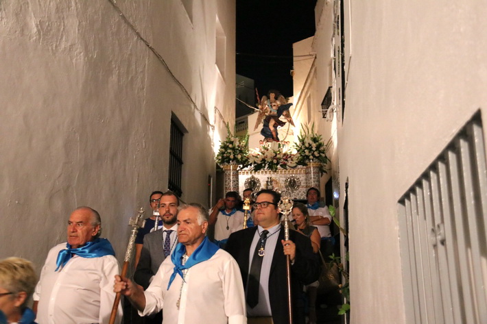 La procesión de San Miguel por las calles del casco antiguo de Almuñécar puso el broche a las fiestas patronales del Barrio de San Miguel, también conocido como El Castillo al ubicarse el monumento en el mismo, que ha venido celebrando desde el pasado viernes en honor a su patrón.