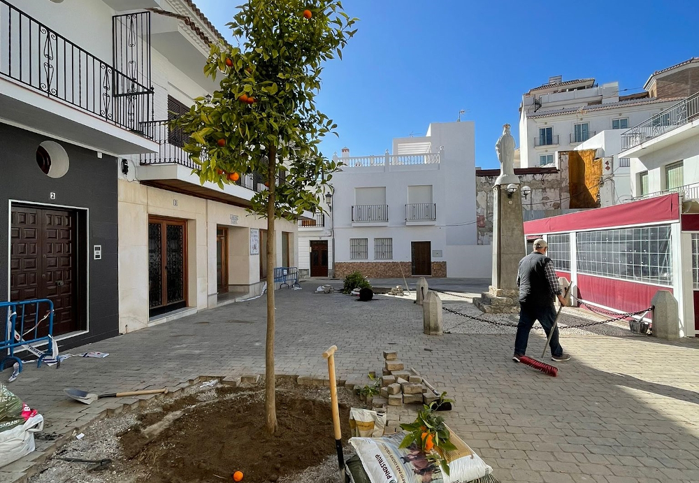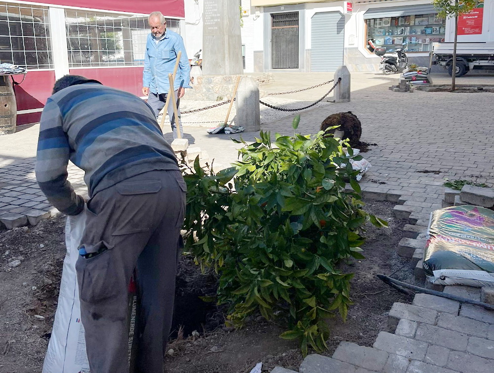 “Tras la retirada de las palmeras washingtonias hemos procedido a la plantación de naranjos, como antiguamente existían en dicha plaza, dando una imagen más acogedora. Las palmeras, además del impacto en la suciedad que generaba en toda la plaza, había superado la altura para poder limpiarla con medios mecánicos y había que hacerlo manualmente con todo lo que ello suponía. A este cambio se sumará los correspondientes alcorques artesanales, además del cambio de mobiliario urbano: bancos y papeleras”, ha explicado el teniente de alcalde herradureño, Juan José Ruiz Joya